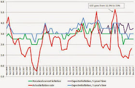 This may be typical of households everywhere, and not just in New Zealand, but even so it's kind of disquieting. As a summary, households generally believe inflation is higher than it actually is (a perceived 2.9% over the period, versus the actual 2.3%), and they expect it to be higher in a year's time (by 0.5% on average, with an expected 3.4%). And the five year inflation rate says much the same thing - on average people expect the long-term inflation rate to be 3.5%. Both the one year and five year forecasts are above the top of RBNZ's inflation target band. Even if you knock off 0.6% as some kind of inherent subjective over-reading of what inflation has been, you still get to the point where people apparently believe inflation is always going to be very close to the top of the RBNZ's target band. And this after over a decade of generally successful inflation targetting.